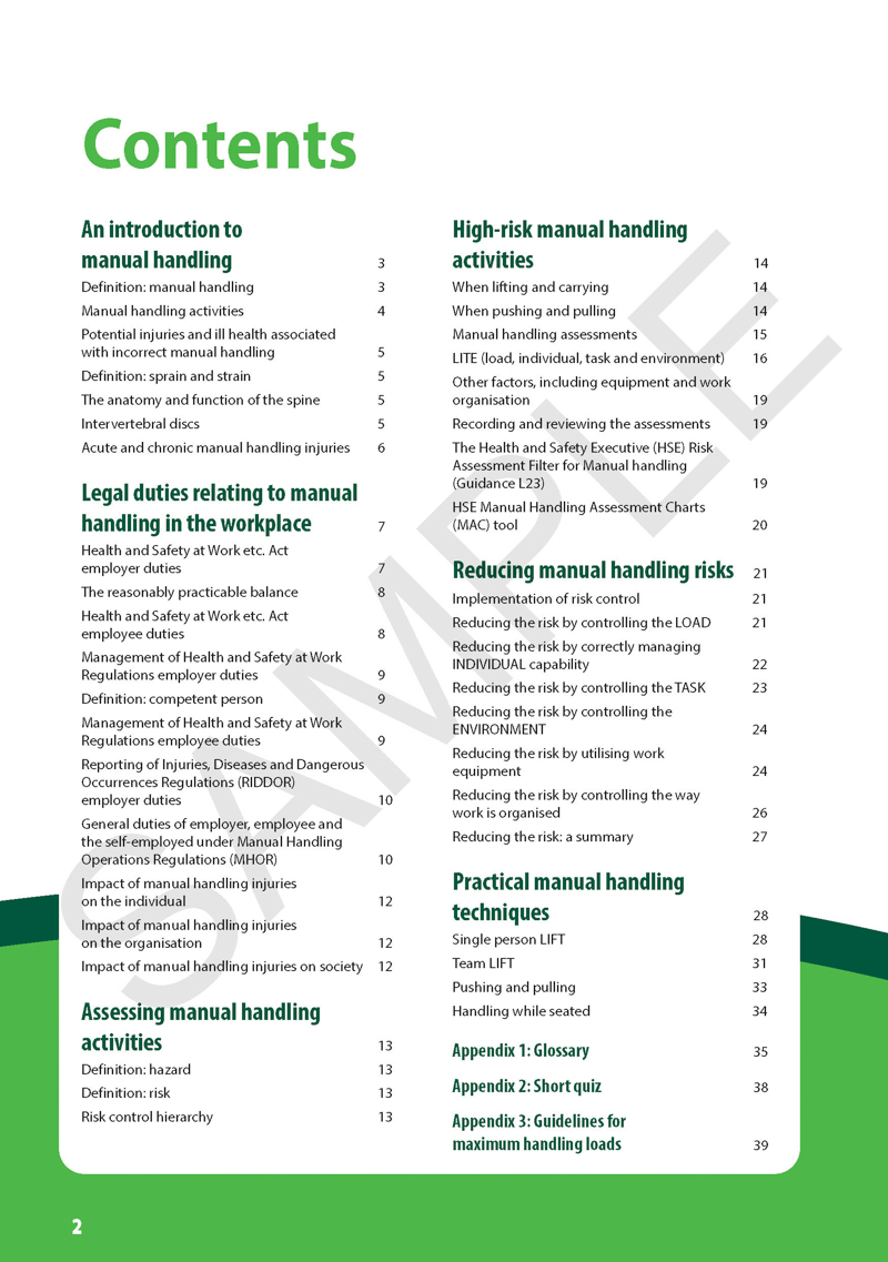 The Safe Moving and Handling Handbook is an essential reference for anyone involved in manual handling of load operations in the workplace. It has also been written for learners taking level 2 manual handling qualifications, and can be used alongside other training resources – such as our Level 2 Safe Manual Handling Training Presentation to provide a complete training experience for learners....